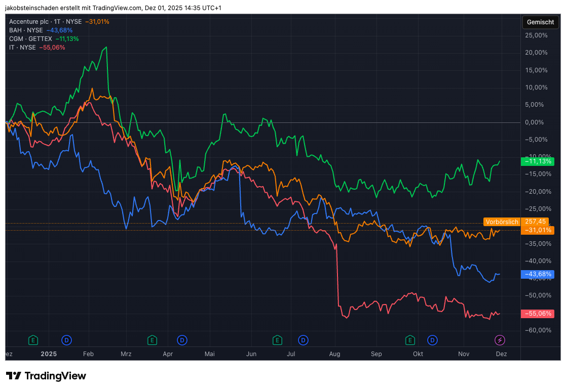 Für Beratungsunternehmen an der Schnittstelle zu IT wie Accenture, Booz Allen Hamilton, Capgemini oder Gartner ist das Thema KI kritisch geworden. Im Jahr drei nach ChatGPT hat man gesehen, dass ihre Aktienkurse (hier in der Ansicht der vergangenen 12 Monate) stark gelitten haben: