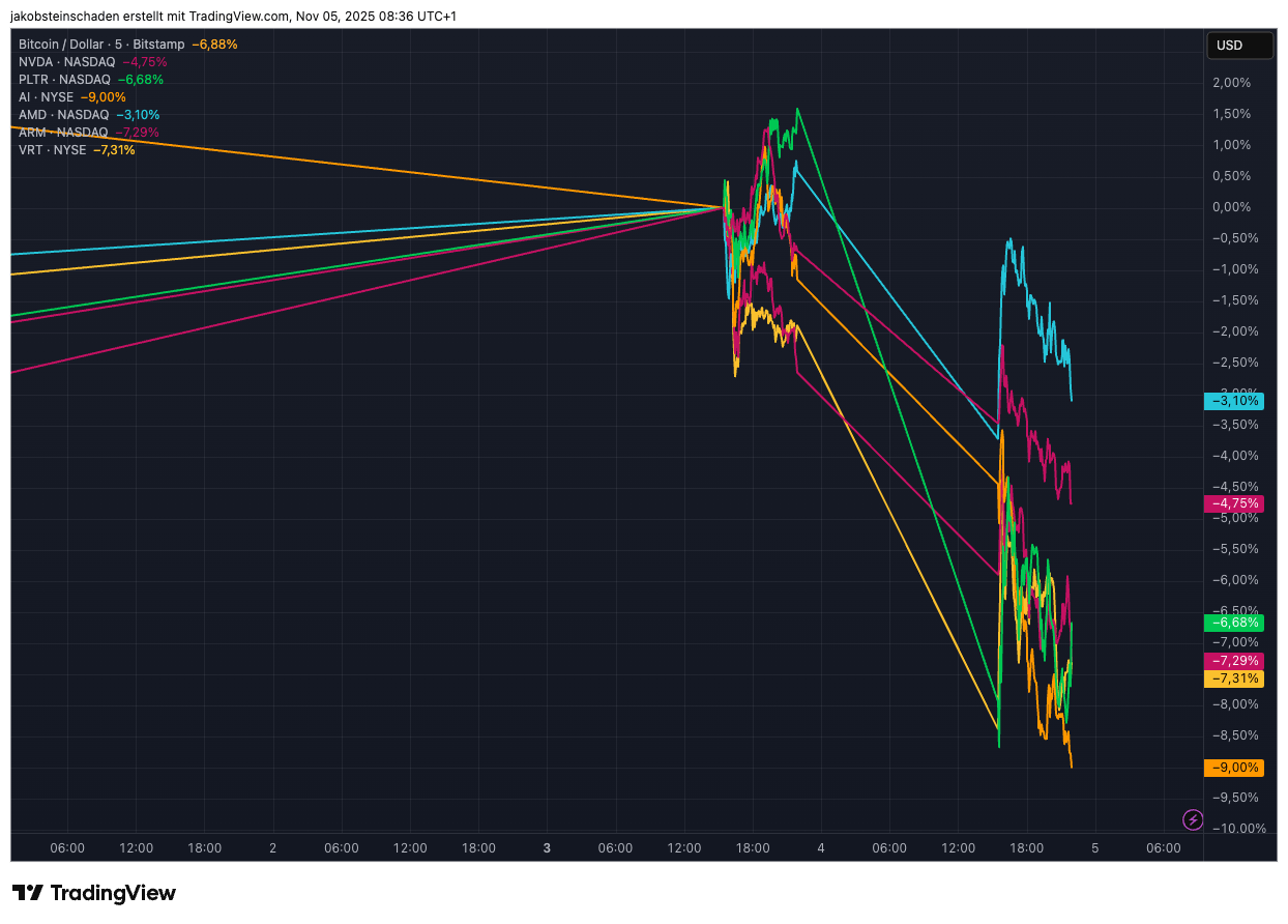 Verschärft wird diese Situation durch eine sehr gewichtige Stimme am Markt: Michael Burry. Der Investor, um den sich der Hollywood-Streifen „The Big Short“ drehte, sagte schon den Zusammenbruch des Immobilienmarkts 2008 vorher. Er hat jetzt massive Wetten gegen Nvidia und Palantir platziert. Dies geht aus einer neuen regulatorischen Einreichung für das am 30. September endende Quartal hervor. Das 13-F-Formular, das am Montag veröffentlicht wurde, legt offen, dass Burrys Fonds Scion Asset Management Put-Optionen auf etwa 5 Millionen Palantir-Aktien im Wert von 912 Millionen Dollar und auf 1 Million Nvidia-Aktien im Wert von 187 Millionen Dollar gekauft hat.
