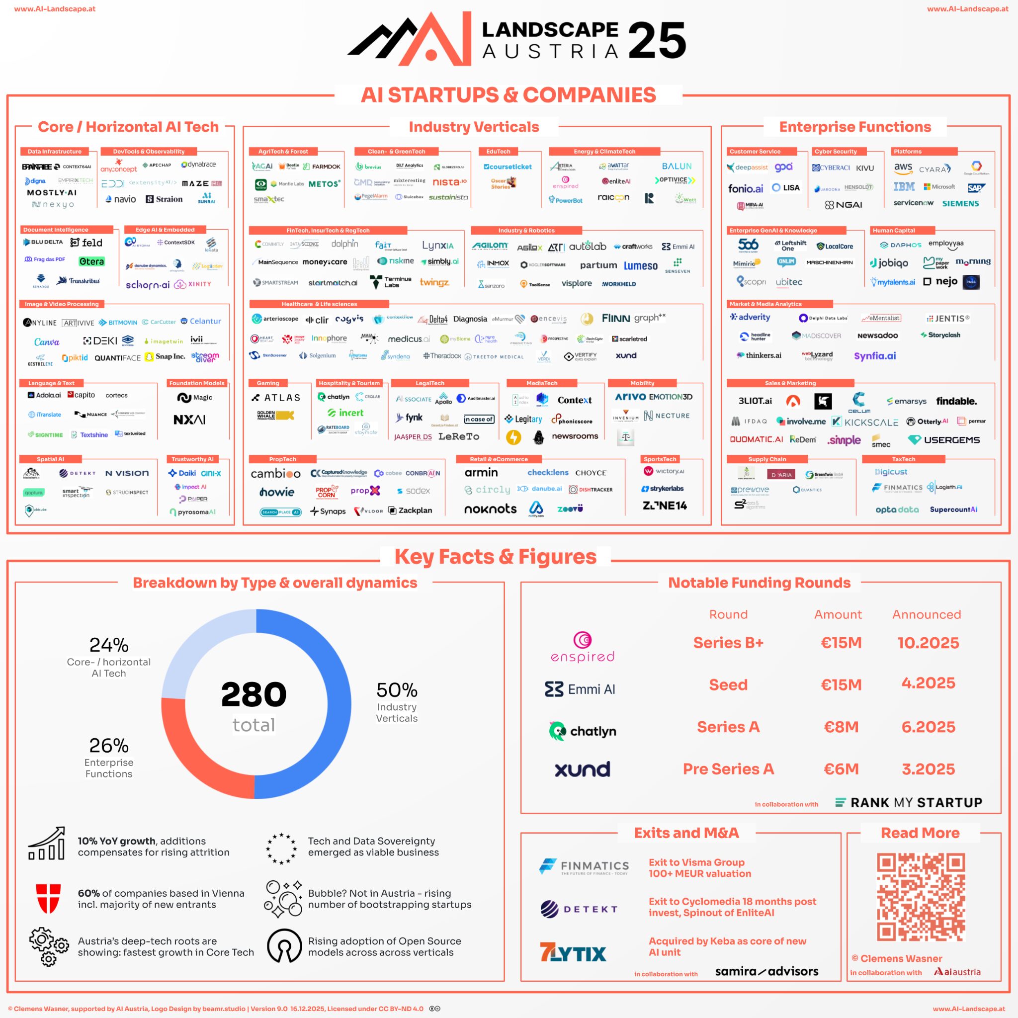 Clemens Wasner hat wieder zugeschlagen. Denn mit AI Austria präsentiert er die neue AI Landscape Austria 2025 – und die zeigt ein Ökosystem im Umbruch. „Wir haben jetzt knapp 300 Logos drauf, nur für AI Startups und Companies“, erklärt Wasner im AI Talk Podcast mit Jakob Steinschaden.