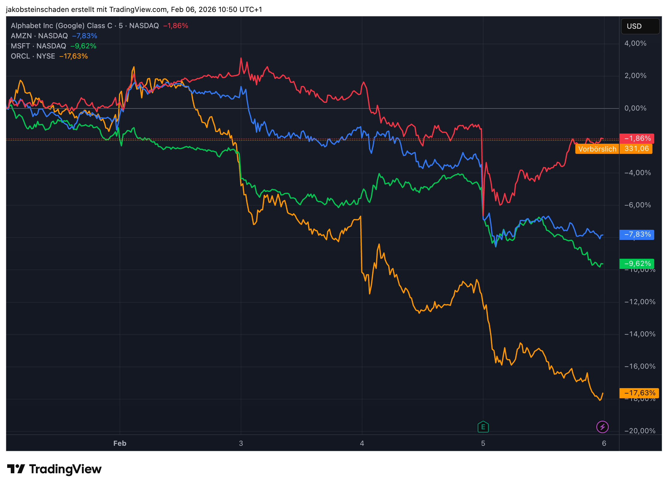 Die breiteren Marktauswirkungen zeigen sich auch in anderen Segmenten: Software-Aktien gerieten unter Druck aufgrund von Befürchtungen, dass neue KI-Programmiertools von Anthropic und OpenAI ihr Geschäft stören könnten. Der technologielastige Nasdaq-Index fiel in den vergangenen fünf Tagen um vier Prozent. Oracle verlor 18 Prozent an Wert, obwohl das Unternehmen 25 Milliarden Dollar Fremdkapital aufnahm und sein Vertrauen in OpenAI beteuerte.