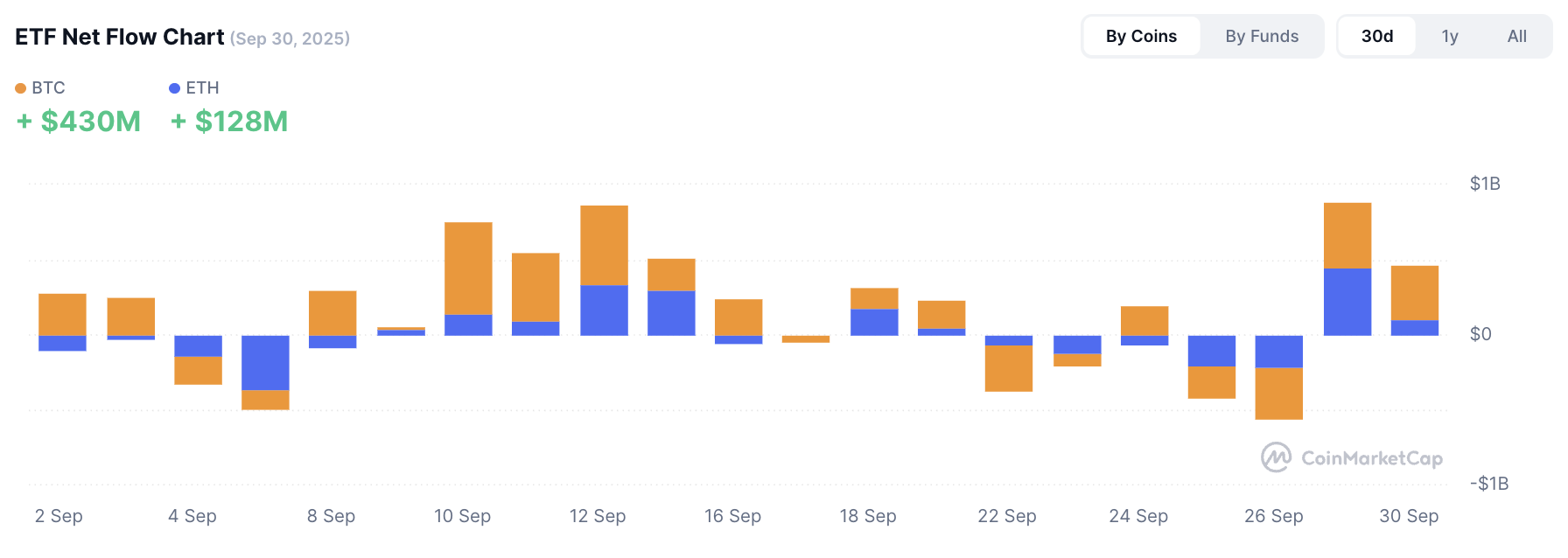 Auch die Wall Street ist nach dem Durchhänger der vergangenen Wochen, der BTC hinunter unter 110.000 Dollar drückte, wieder auf den Geschmack gekommen: US‑Spot‑ETFs für Bitcoin und Ether verzeichneten am 29. September mehr als 1 Milliarde US‑Dollar Nettozuflüsse, angeführt von Fidelitys FBTC, was nach Wochen der Abflüsse einen Stimmungsumschwung signalisiert. Auch am 30. September gab es viele Zuflüsse, wenn auch etwas weniger als am Vortag. Über das gesamte dritte Quartal hinweg summierten sich die Zuflüsse in Bitcoin‑ETFs trotz zwischenzeitlicher Schwäche auf rund 7,8 Milliarden US‑Dollar, was die strukturelle Nachfrage stützt.