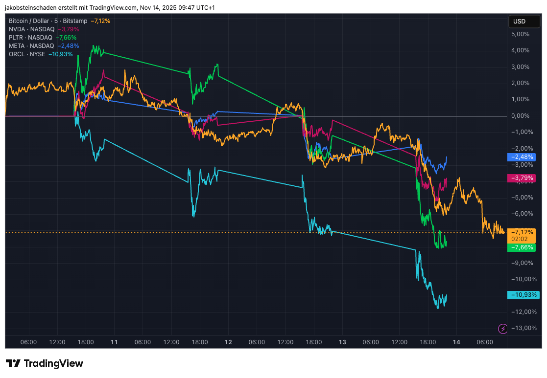 Nicht zu vergessen ist auch, dass Krypto-Assets wie eben Bitcoin oder Ethereum in der Vergangenheit auch immer wieder deutliche Parallelen zur Preisentwicklung von Tech-Aktien aufwiesen. Diese haben diese Woche ebenfalls Sell-offs gesehen. Hier BTC und ETH im Vergleich zu Aktien wie jenen von Meta, Nvidia, Palantir oder Oracle:
