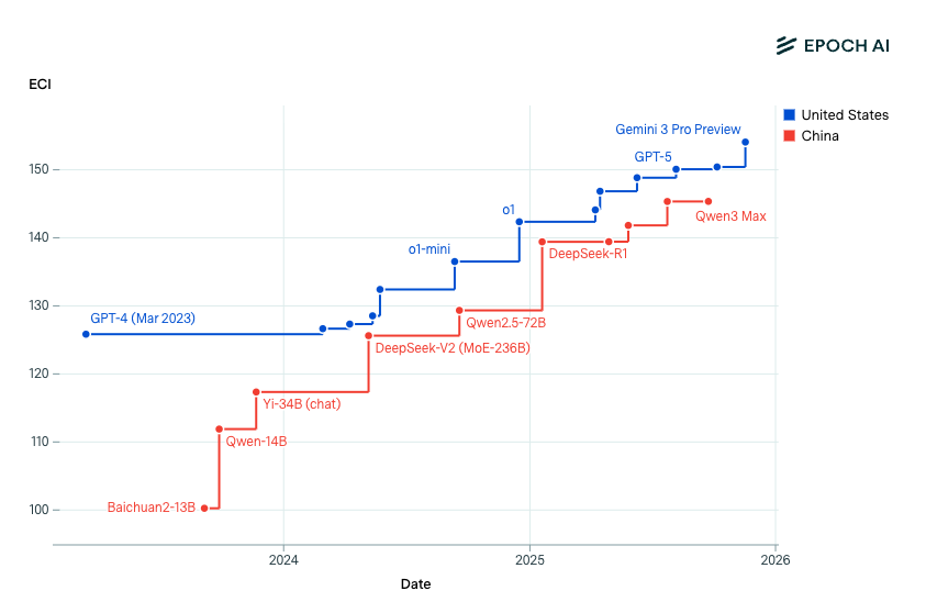 Jedes Modell, das seit 2023 an die Spitze der KI-Fähigkeiten vorgestoßen ist, stammt aus den Vereinigten Staaten. Modelle wie GPT-4, o1 und Gemini 3 Pro Preview setzen die Benchmarks, an denen sich chinesische Entwicklungen wie DeepSeek-R1, Qwen2.5-72B oder Yi-34B messen lassen müssen. Die Daten des ECI dokumentieren diese Dominanz lückenlos über einen Zeitraum von drei Jahren.