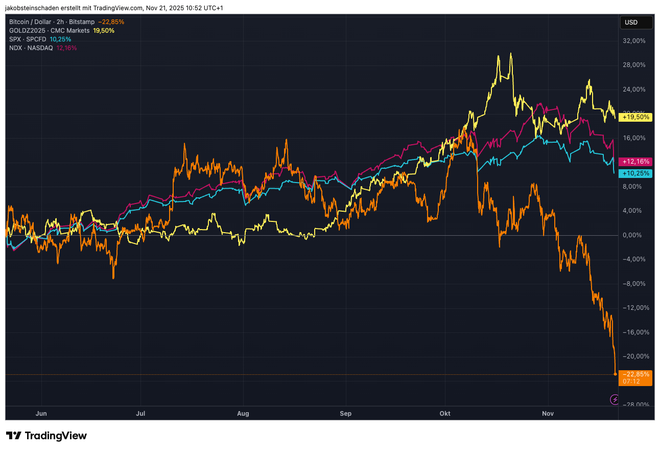 Doch oft, wenn sich viele sehr sicher sind, kommt es anders. Insbesondere im Krypto-Markt. Anstatt der Branche einen „Moonvember“ (also einen November mit Kursen, die zum Mond schießen) zu bescheren, krachen die Preise für Bitcoin, Ethereum und Co in sich zusammen. Seit dem Allzeithoch für Bitcoin am 6. Oktober bei 126.000 Dollar hat die größte Kryptowährung innerhalb von sechseinhalb Wochen 33 Prozent seines Wertes verloren – am heutigen Freitag vormittag sind es nur mehr 84.000 Dollar, die pro BTC an den Börsen gezahlt werden.
