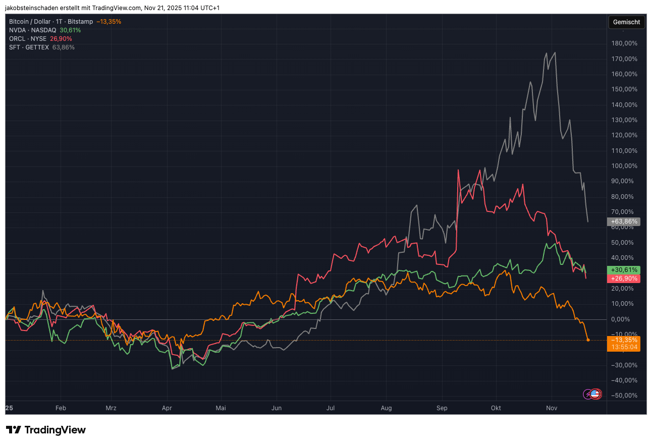 Solche Marktmechanismen sorgen dafür, dass sich der Bitcoin-Preis schnell zu drehen beginnen kann und dann in Kaskaden verstärkt (oder wie heute: geschwächt) wird. Das unterscheidet Bitcoin – in negativer Weise – auch von AI-Aktien wie von Nvidia oder Palantir, die aktuell ebenfalls stark nachgeben, weil die Ängste einer KI-Blase durch die Märkte fegen. Jedoch verlieren weder Nvidia, noch Palantir, noch Oracle, noch Softbank so stark und so schnell wie Bitcoin: