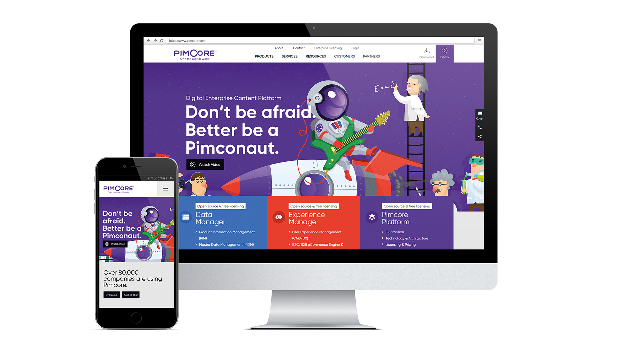 Logo, Claim, Website bis hin zum animierten Imagefilm. elements entwickelte für das internationale Softwareunternehmen Pimcore den brandneuen Markenauftritt.