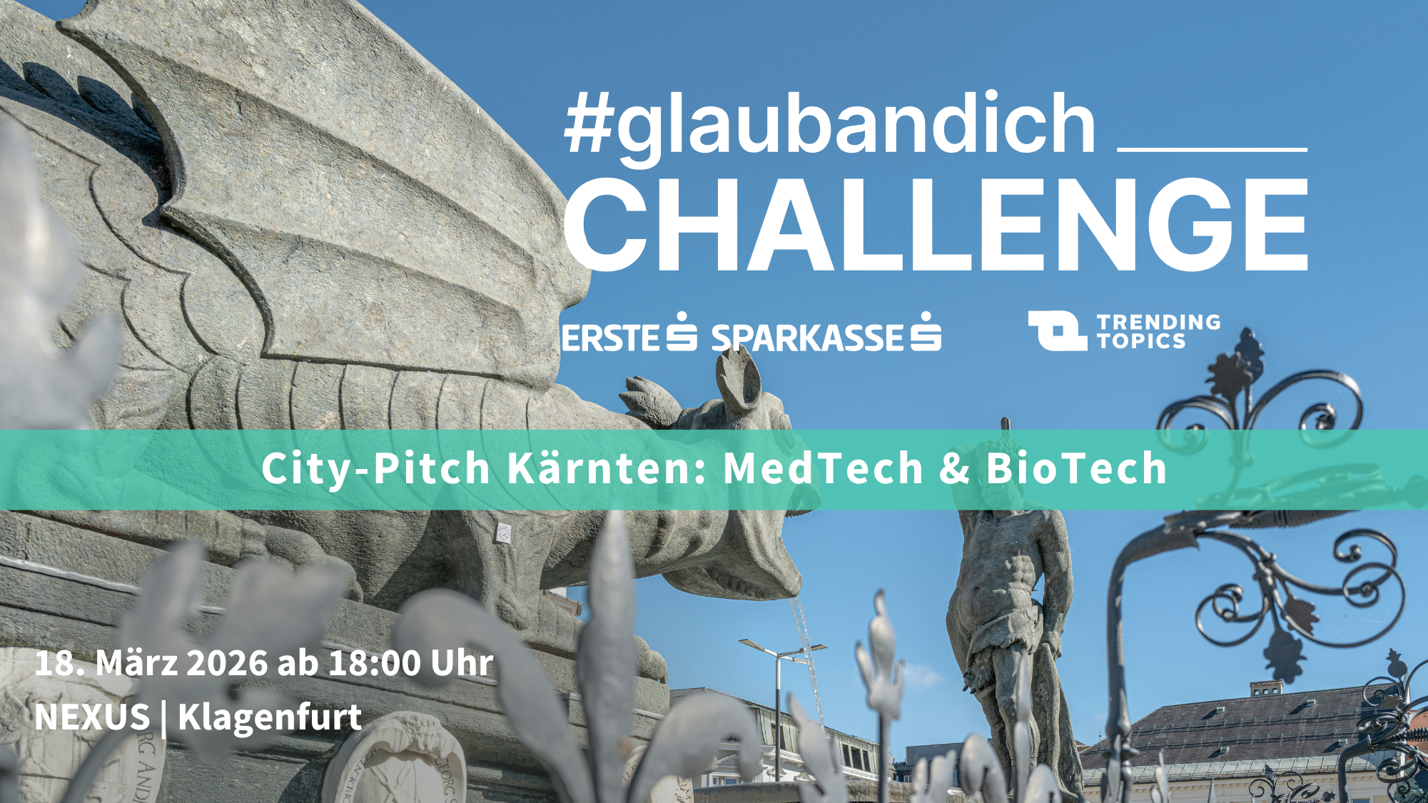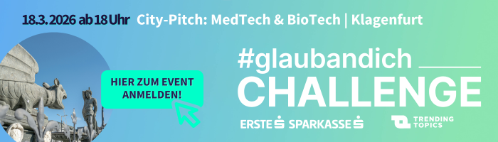 Der achte City-Pitch führt die #glaubandich CHALLENGE 2026 nach Kärnten. Am Mittwoch, dem 18. März, findet das Event in Klagenfurt im Coworking-Space NEXUS powered by Kärntner Sparkasse statt. Die Kategorie: „MedTech & BioTech“! Insgesamt sieben Startups aus diesem Bereich präsentieren auf der Bühne ihre Pitches.