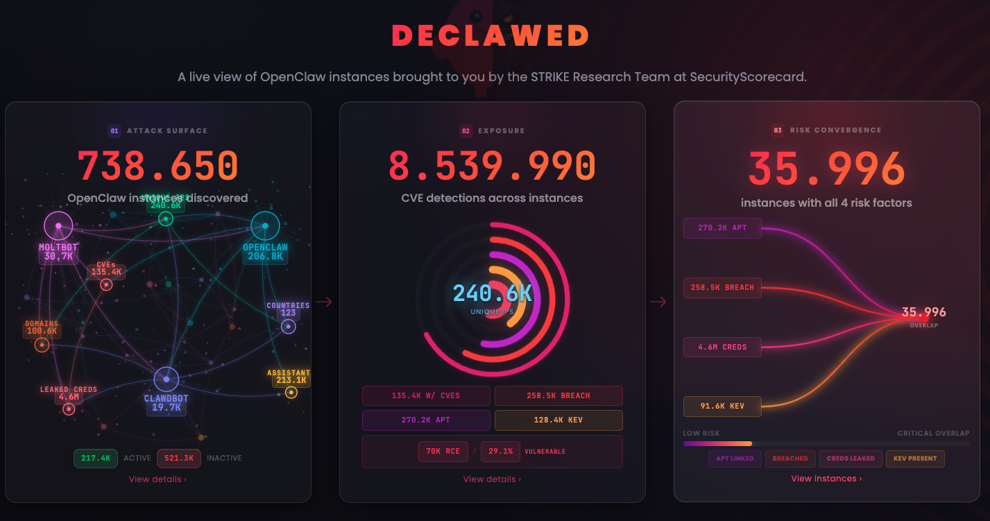 Insgesamt sind aktuell laut dem Cybersecurity-Team von Strike Research knapp 740.000 OpenClaw-Instanzen im Web auffindbar, etwa 36.000 davon haben gleich vier schwerwiegende Risikofaktoren und sind damit einfach angreifbar: