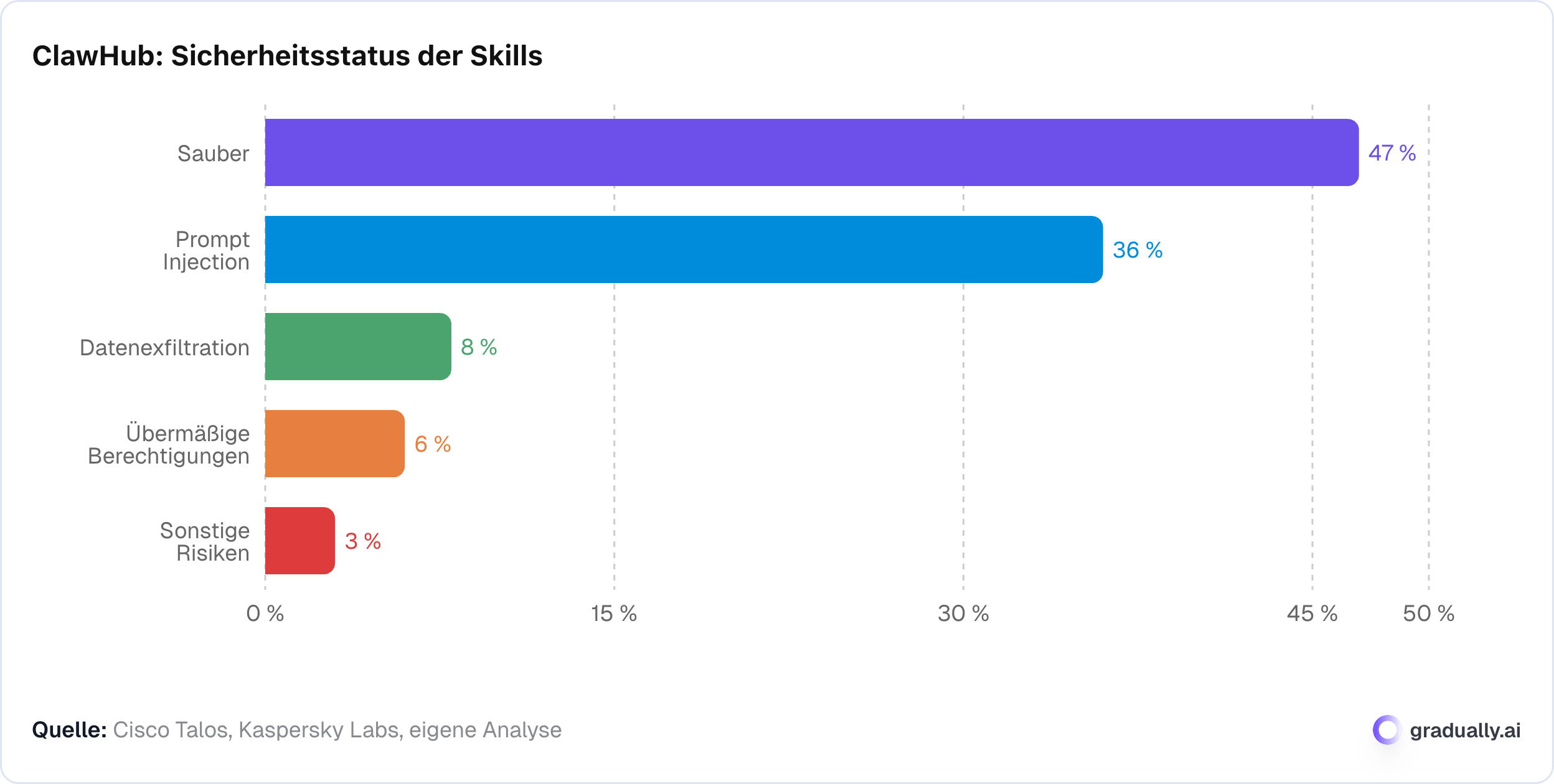 Von den 12.400 Skill-Entwicklern auf ClawHub sind lediglich 847 (6,8 Prozent) von der Plattform verifiziert. Über 93 Prozent aller Anbieter haben also keinen Identitätsnachweis erbracht. Eine verpflichtende Sicherheitsprüfung existiert bislang nicht. Die OpenClaw Foundation hat zwar einen entsprechenden Prozess angekündigt, konkrete Umsetzungsschritte stehen jedoch noch aus.