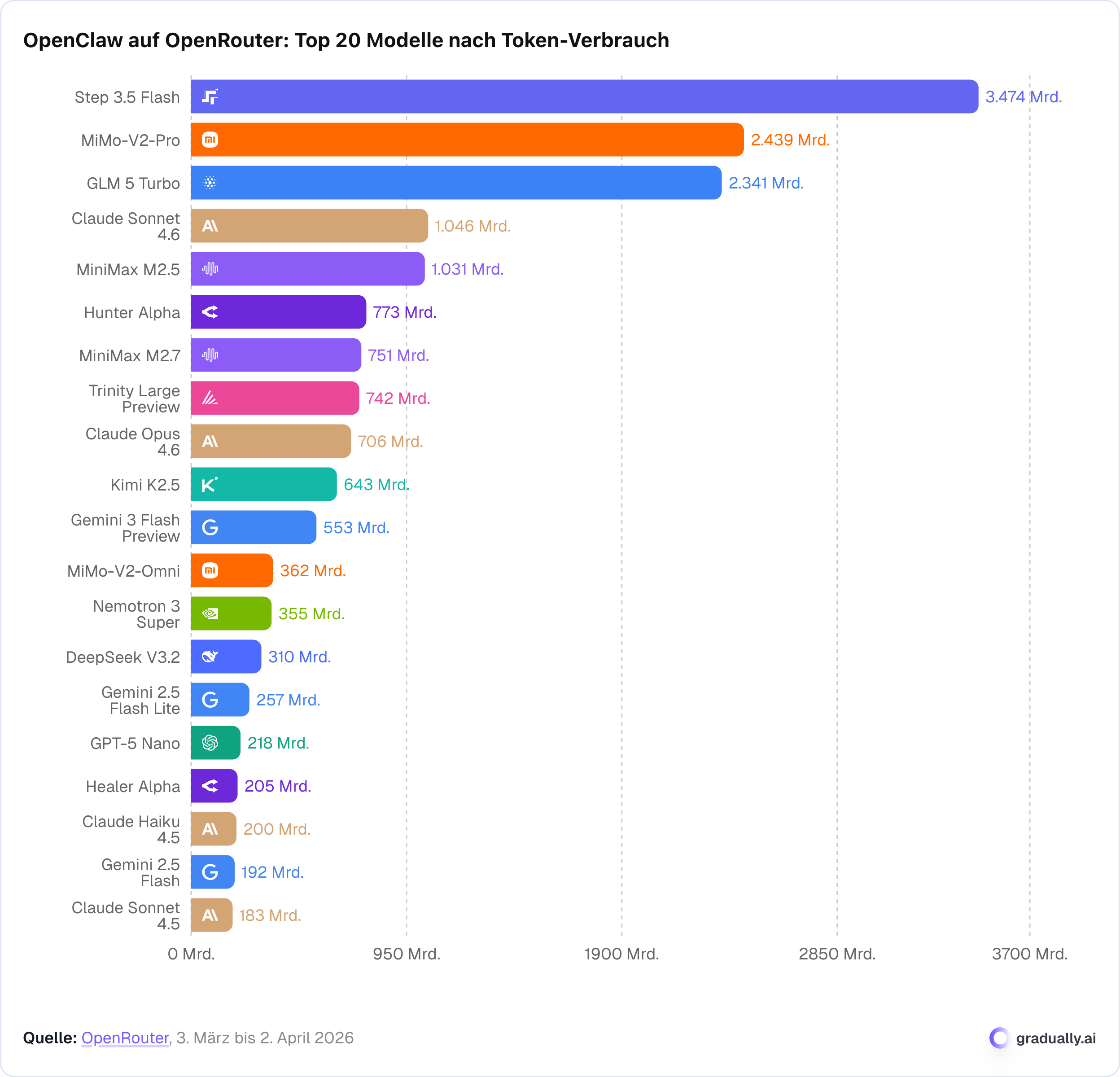 OpenClaw unterstützt nahezu alle gängigen Sprachmodelle. Daten der Routing-Plattform OpenRouter, die viele OpenClaw-Nutzer zur Weiterleitung ihrer Anfragen verwenden, geben Aufschluss darüber, welche Modelle tatsächlich im Einsatz sind. Ausgewertet wurde der Zeitraum vom 3. März bis zum 2. April 2026.