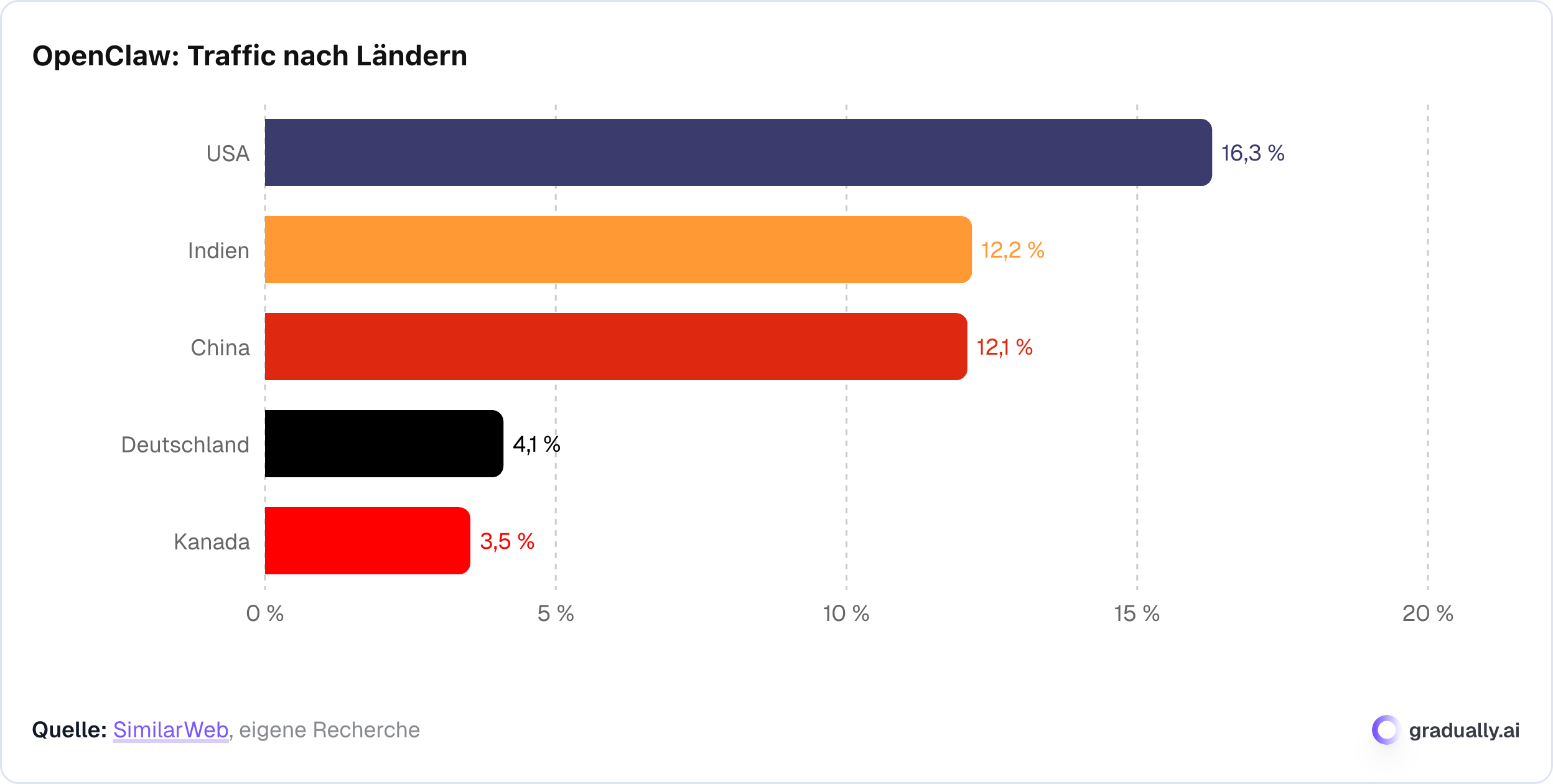 Die Nutzerbasis von OpenClaw verteilt sich auf alle Kontinente, wobei die USA mit 16,3 Prozent des Traffics knapp vor Indien (12,2 Prozent) und China (12,1 Prozent) liegen. Diese nahezu gleichmäßige Verteilung der Top-3-Länder ist für ein Tech-Tool ungewöhnlich. Bei den meisten vergleichbaren Plattformen dominieren die USA deutlich stärker.