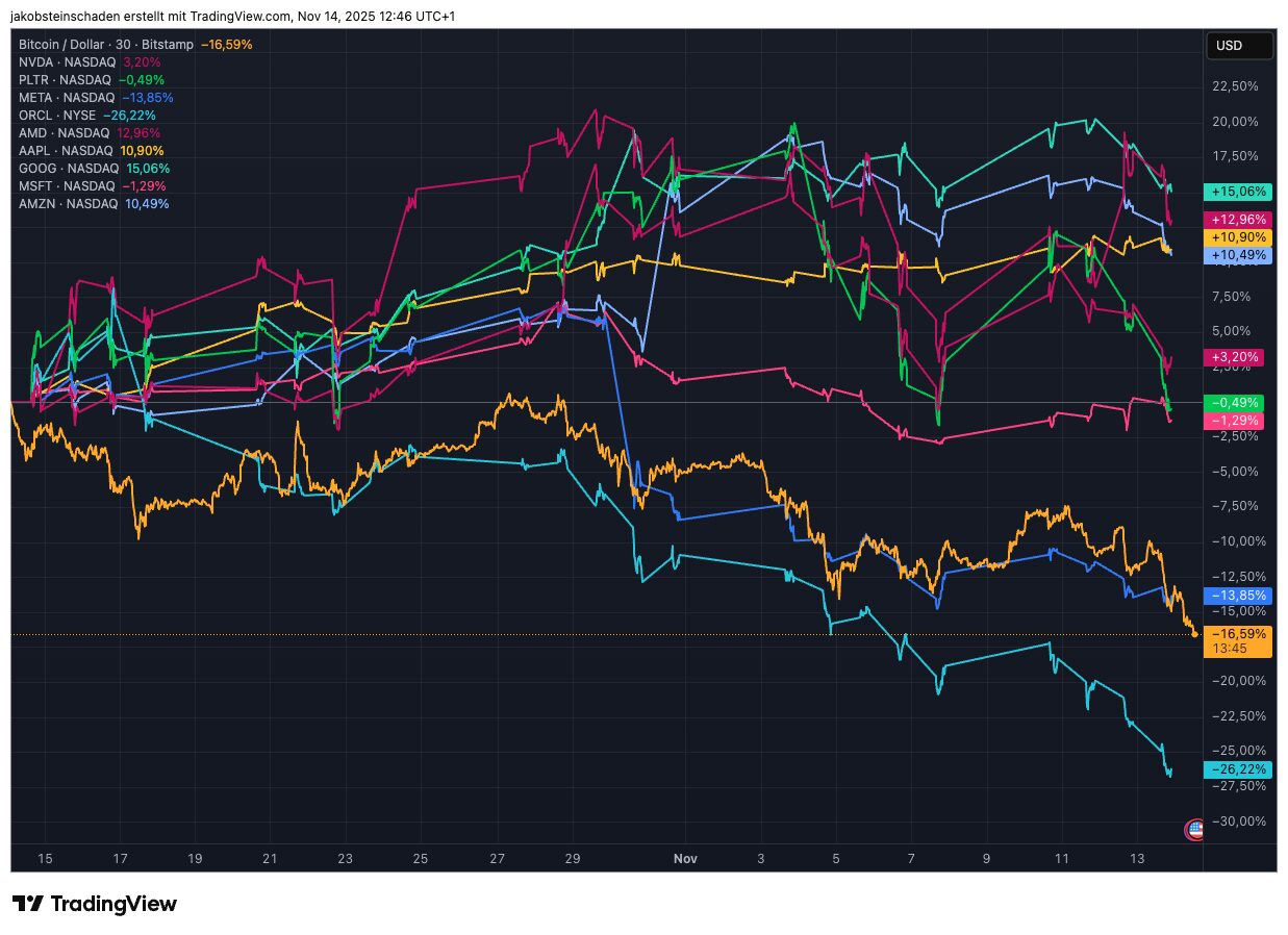 Oracle erlebt derzeit den härtesten Absturz unter den großen Tech-Konzernen. Die Aktie hat in den vergangenen vier Wochen fast etwa 26 Prozent verloren – nahezu doppelt so viel wie der nächstschlechteste Hyperscaler Meta. Der Grund: Wall Street zweifelt massiv an der schuldenfinanzierten AI-Strategie des Software-Giganten. Oracle hat sich verpflichtet, in den kommenden Jahren Hunderte Milliarden Dollar in Chips und Rechenzentren zu investieren, größtenteils für Deals mit OpenAI.