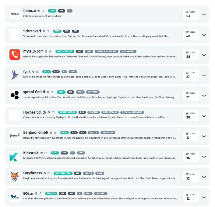 Die weiteren Startups in den Top 10 sind fynk, sproof, Hochzeit.click, Bergardi, Kickscale, Fofyfitness rund um Florian Gschwandtner und 506.ai: