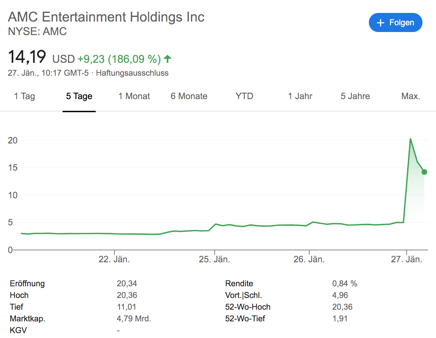 Ziel Nummer zwei ist nun die Aktie von AMC Entertainment – der weltweit operierende Betreiber von Kinos hat durch die Corona-Krise und die damit verbundenen Lockdowns wenig verwunderlich ebenfalls schwer gelitten. Nun eilt den gestürzten Aktienkurs die wallstreetbets-Meute zu Hilfe – und AMC legt plötzlich innerhalb eines Tages um mehr als 170 Prozent zu. Im Forum wurde angekündigt, AMC „to the moon“ zu schicken – ein beliebter Schlachtruf. Die Kursschwankungen waren so stark, dass zu Beginn der Woche der Handel der Aktien an der Wal Street mehrere Male ausgesetzt wurde (das passiert dann, wenn ein Titel innerhalb von fünf Minuten mehr als 10 Prozent seines Wertes verliert oder gewinnt).