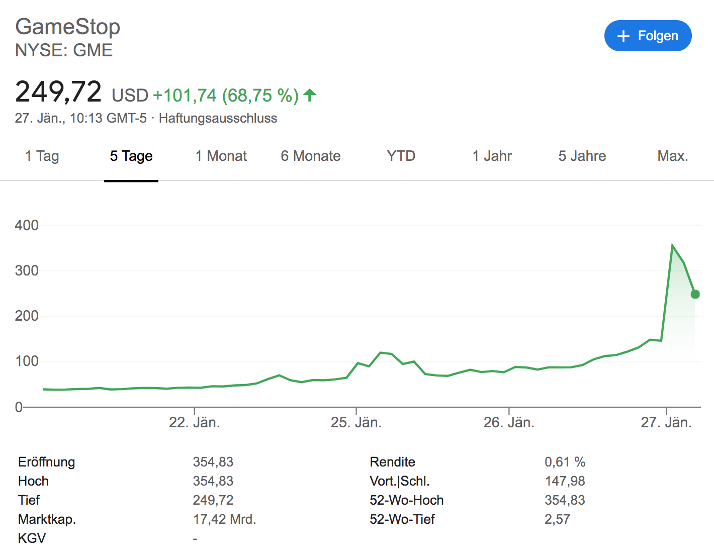 Ein Angriff des Internet-Mobs auf die Wall Street – so könnte man die Aktionen, die man aktuell an den Börsen sehen kann, auch bezeichnen. Begonnen hat es mit der Aktie des Videospiele-Händlers Gamestop (GME), der durch die Corona-Krise noch einmal zusätzlich litt. Die wallstreetbets-Anhänger, die über Kanäle wie Dischord, Twitch oder Twitter mit flotten Memes zum Kauf von GME-Aktien anstachelten, haben erreicht, dass das Papier innerhalb eines Tages um mehr als 100 Prozent zulegte.