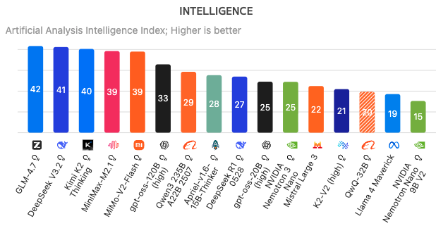Zhipu AI, das international unter der Marke Z.ai auftritt, ist vor allem für seine GLM-Modelle bekannt geworden. GLM-4.7 zählt bei LMArena derzeit zu den 20 besten KI-Modellen weltweit, und rangiert aktuell bei Artificial Analysis als bestes Open Source-Modell der Welt – noch vor DeepSeek, OpenAI oder Kimi K2 von Moonshot AI.
